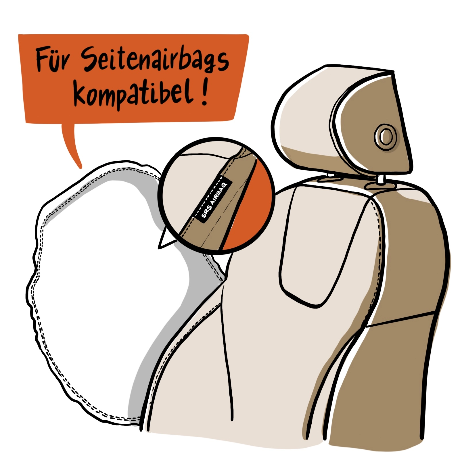 Alle unsere Sitzbezüge sind für Seitenairbags zugelassen und dürfen in Fahrzeugen mit eingebauten Seitenairbags verbaut werden.